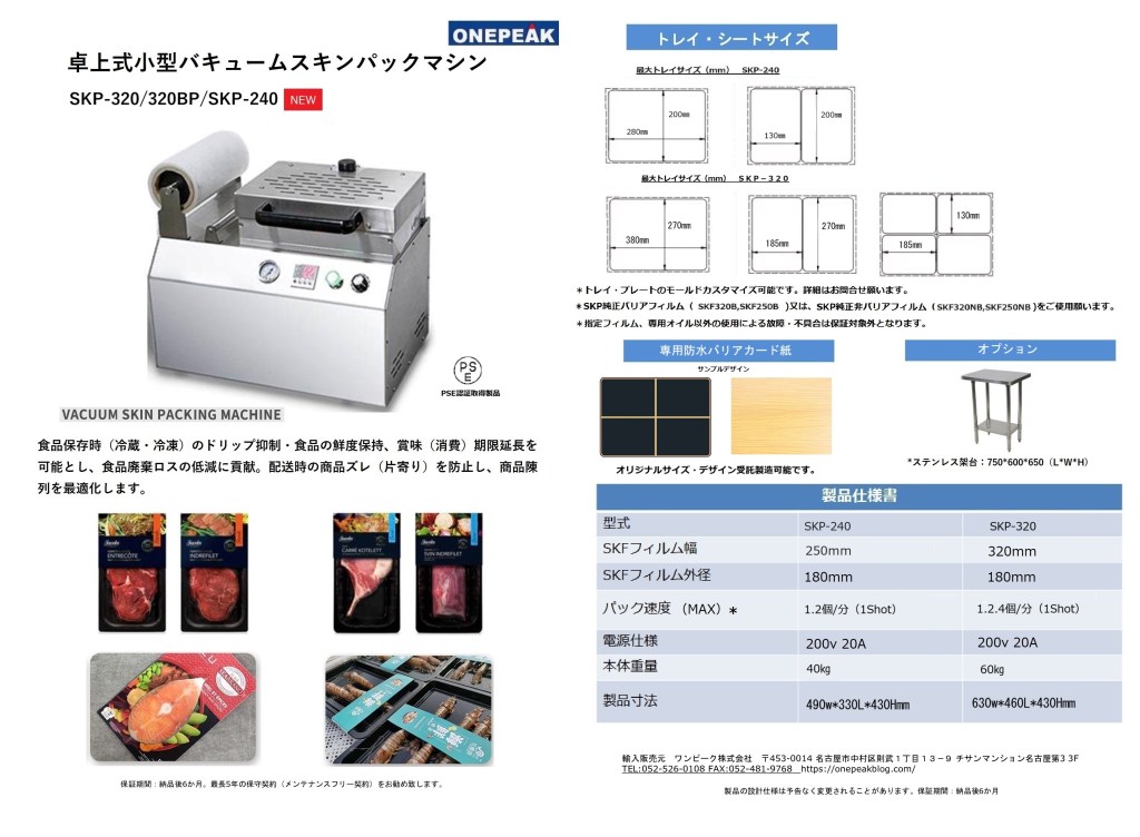 PackingMachine 卓上式小型スキンパック包装機 SKP-320/SKP320BP/SKP-240スキンパック包装はヨーロッパではメジャーな包装形態です。食品保存時(冷蔵・冷凍)のドリップ抑制、食品の鮮度保持・賞味(消費)期限延長を可能とし、食品廃棄ロスの低減に貢献します。配送時の商品ズレ(片寄り)を防止し、商品陳列を最適化します。経済産業省管轄 サークルPSE認証取得製品 共有: X で共有 (新しいウィンドウで開きます) X Facebook で共有 (新しいウィンドウで開きます) Facebook いいね 読み込み中…